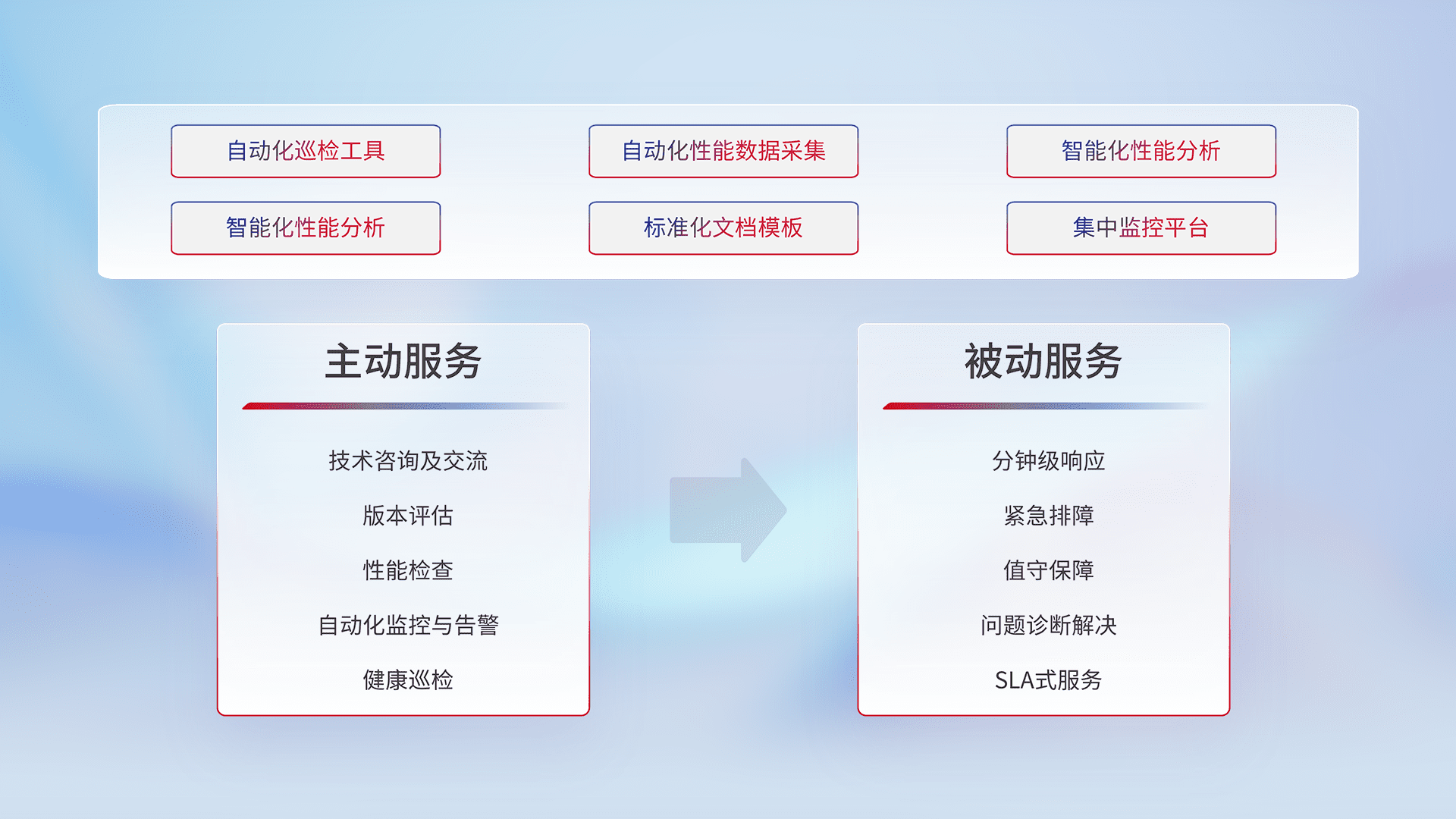 智能化工具和标准化文档,,,保障服务质量,,提供主动服务(包含技术咨询、、版本评估、、、性能检查、、、自动化监控与告警、、、、健康巡检)和被动服务包含(分钟级响应、、紧急排障、、、、值守保障、、问题诊断解决、、、SLA服务)。。。。